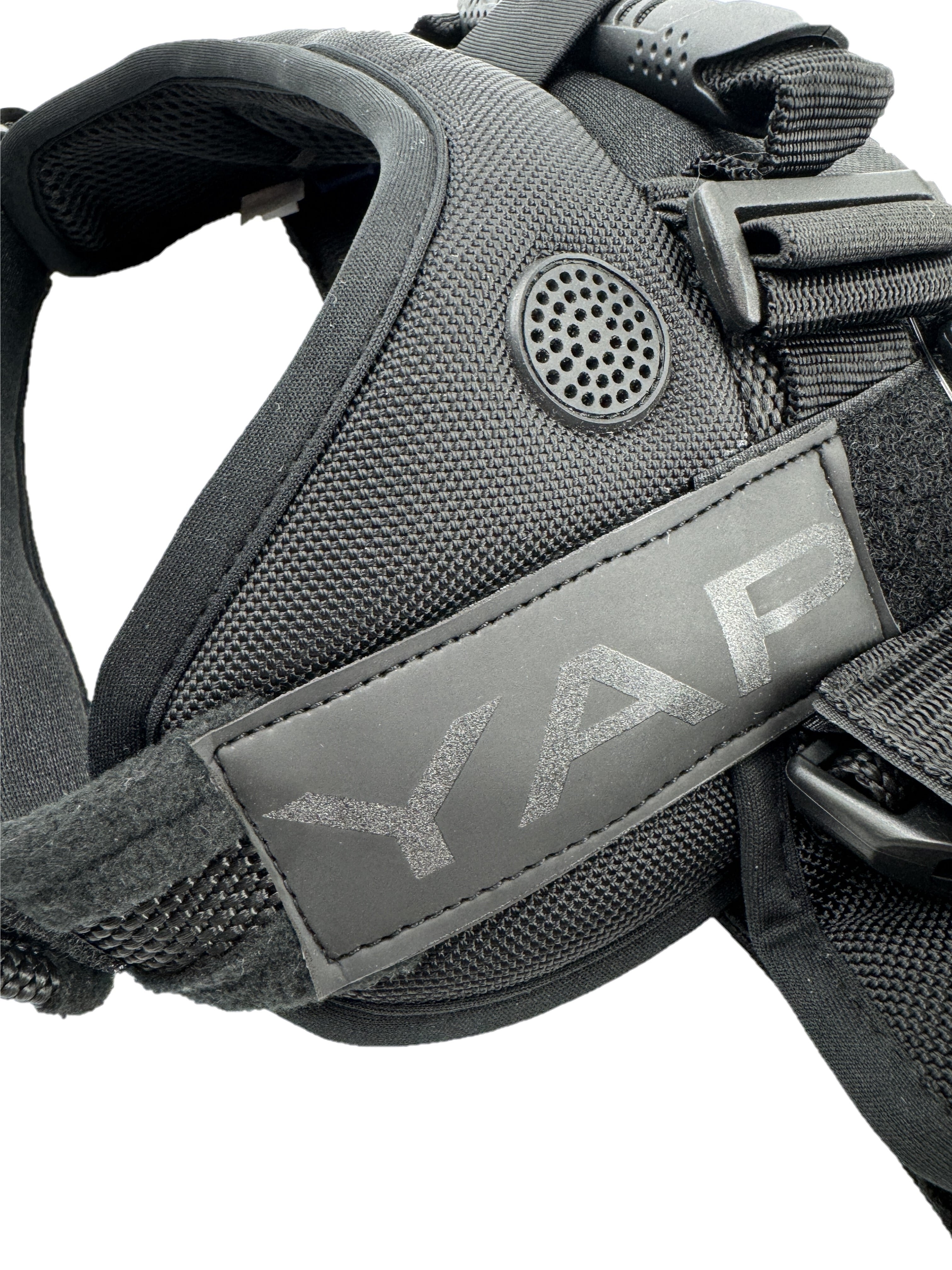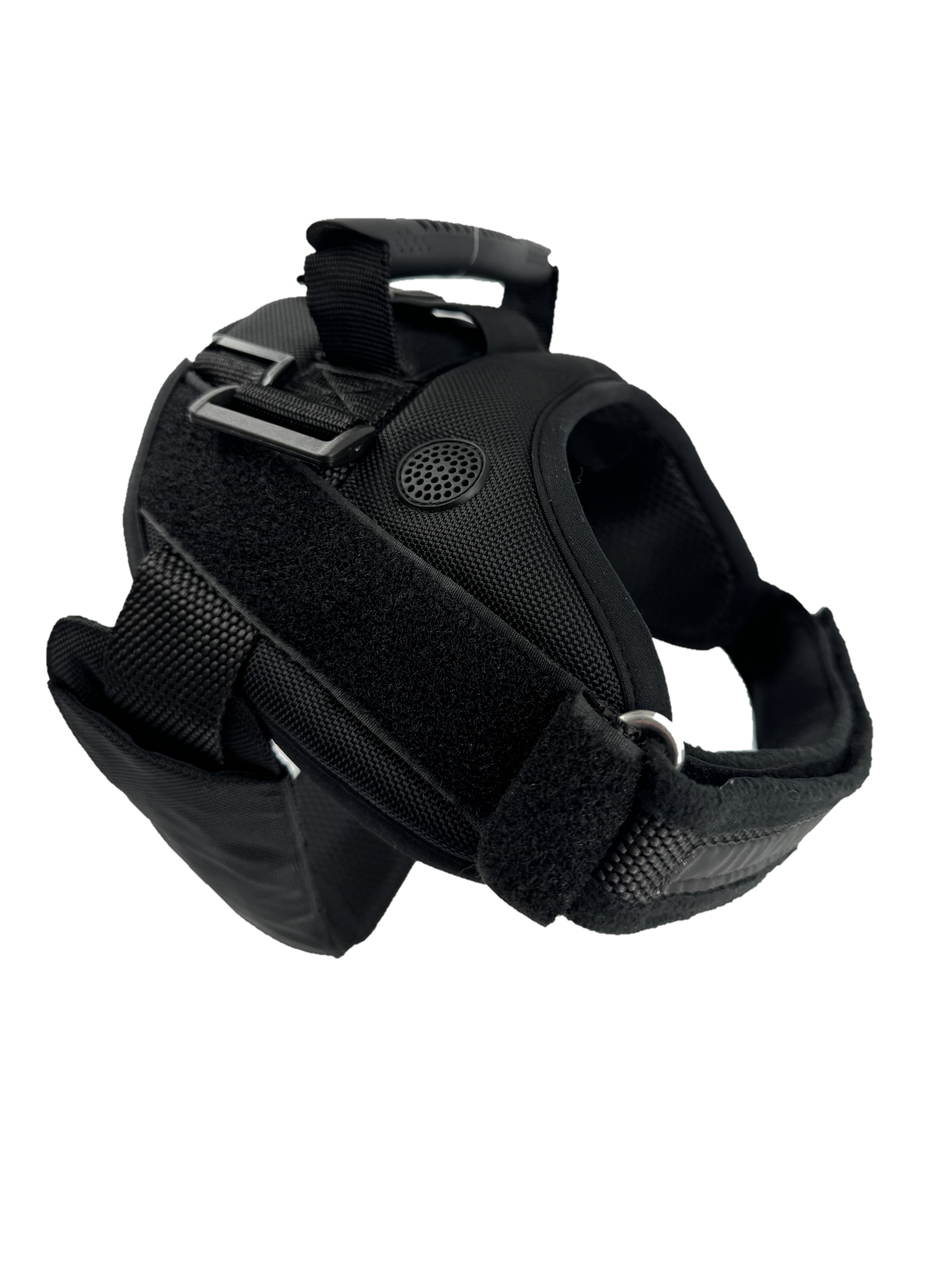 ハーネス前部、ロゴ部分には反射材を使用しており夜間の視認性を高めているほか、内側にはGPSタグ等を収納できる小さなポケットを採用しています。