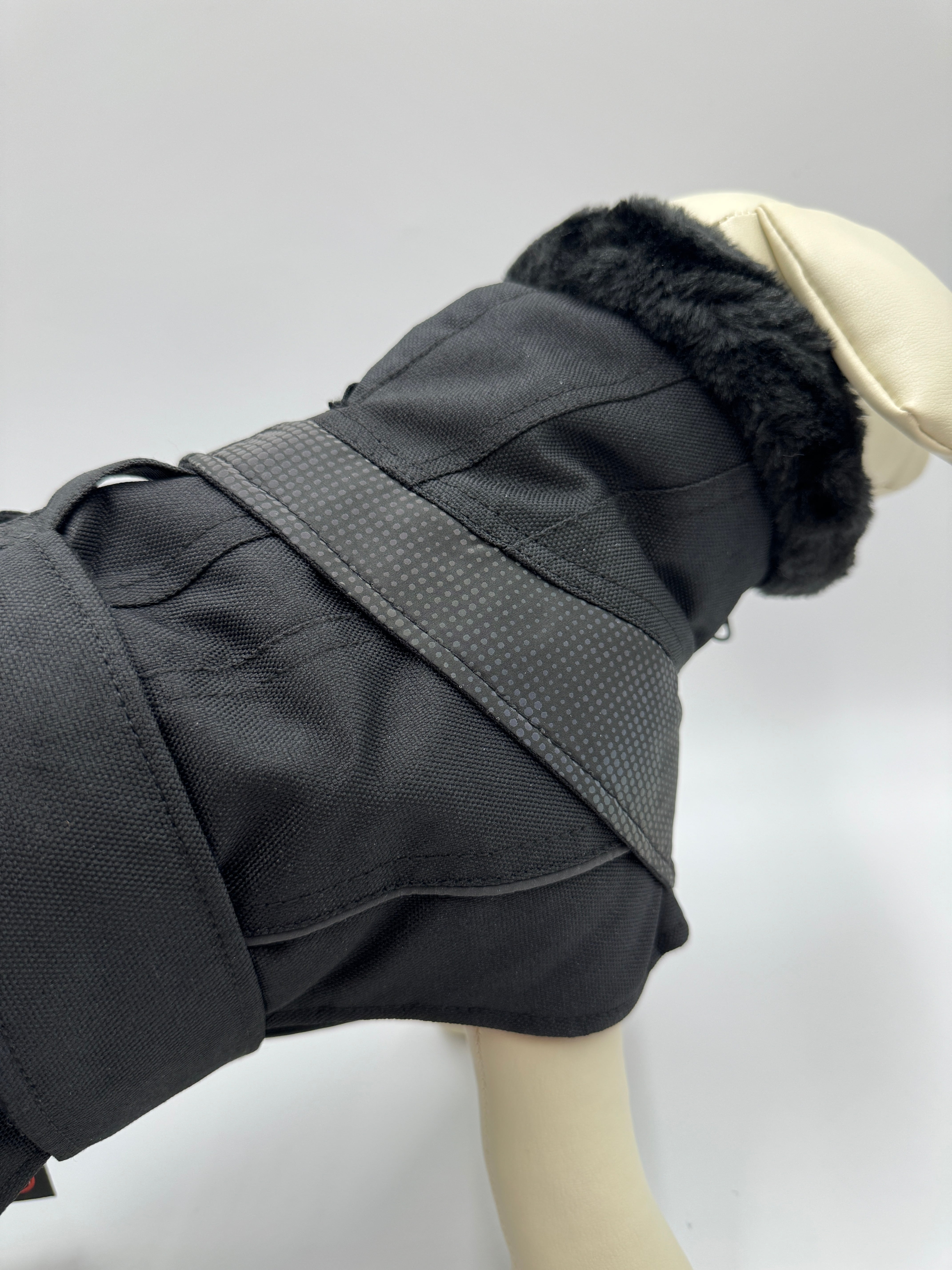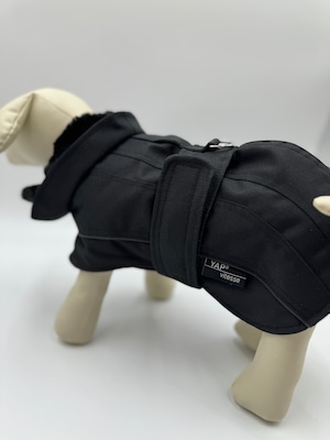 首元にはジッパーが装着されており、折り返してご使用いただくことも可能です。襟元内側はファー加工されており暖かいだけでなく愛犬の顔周りをシックでエレガントに見せてくれます。