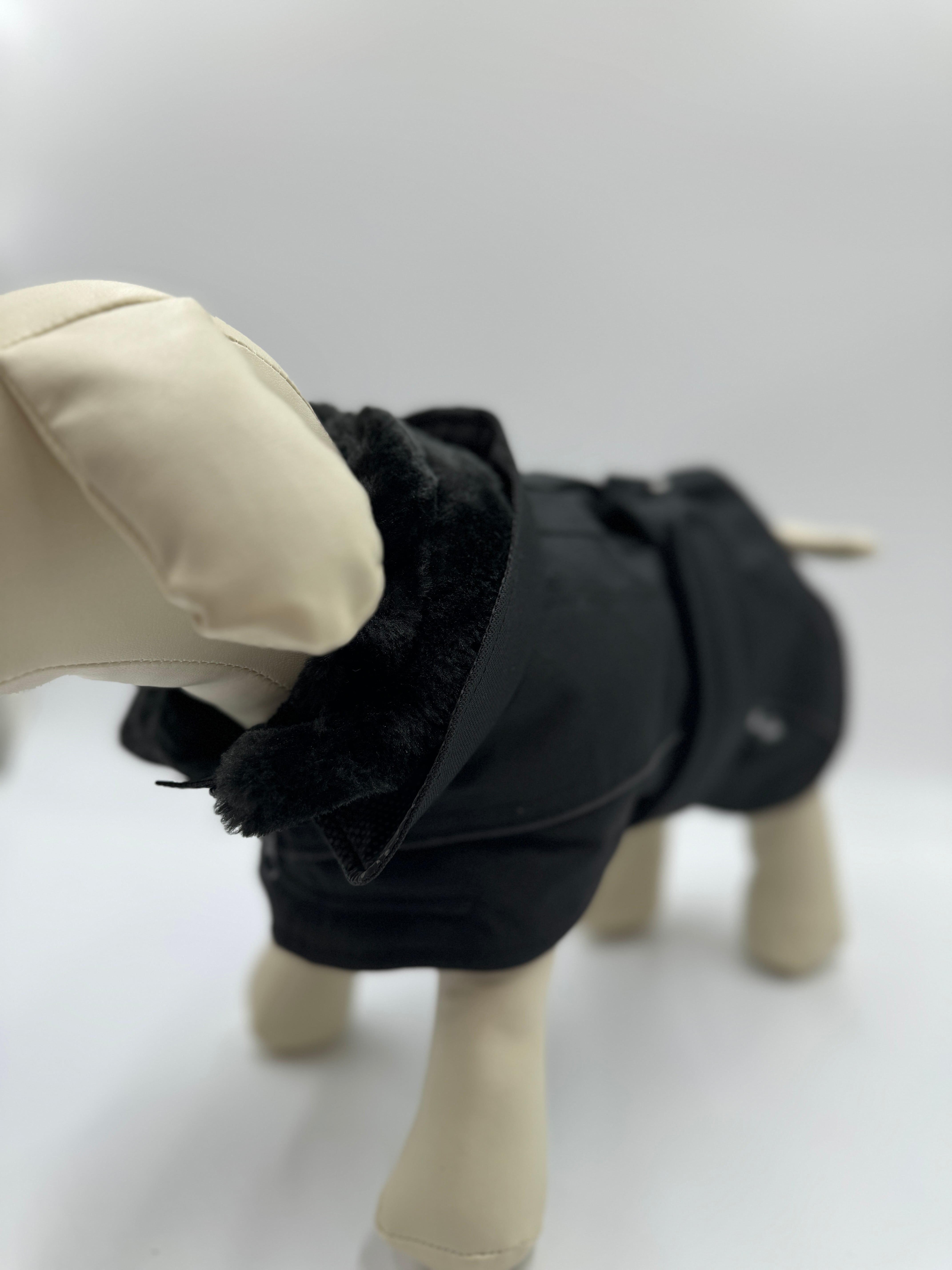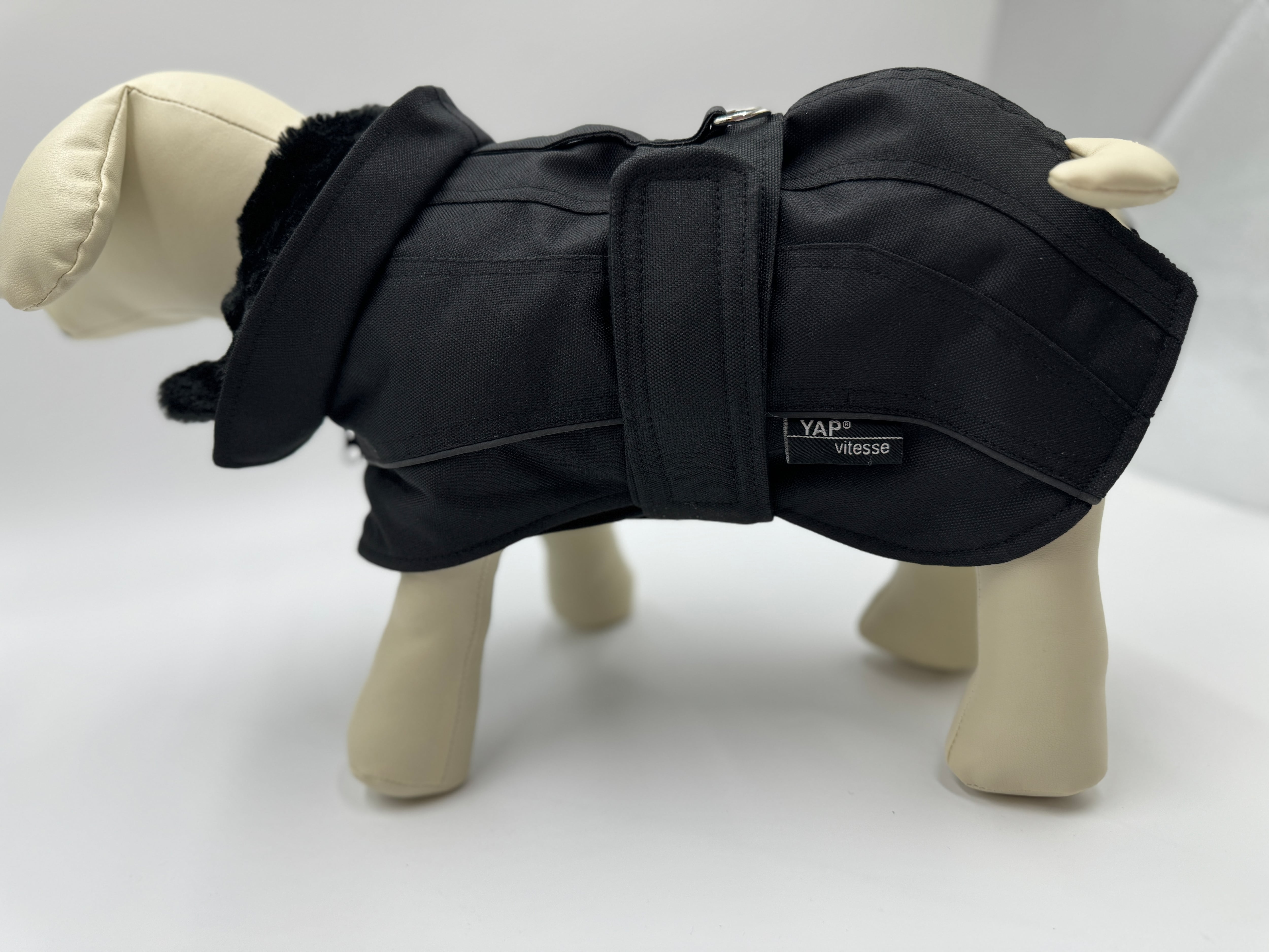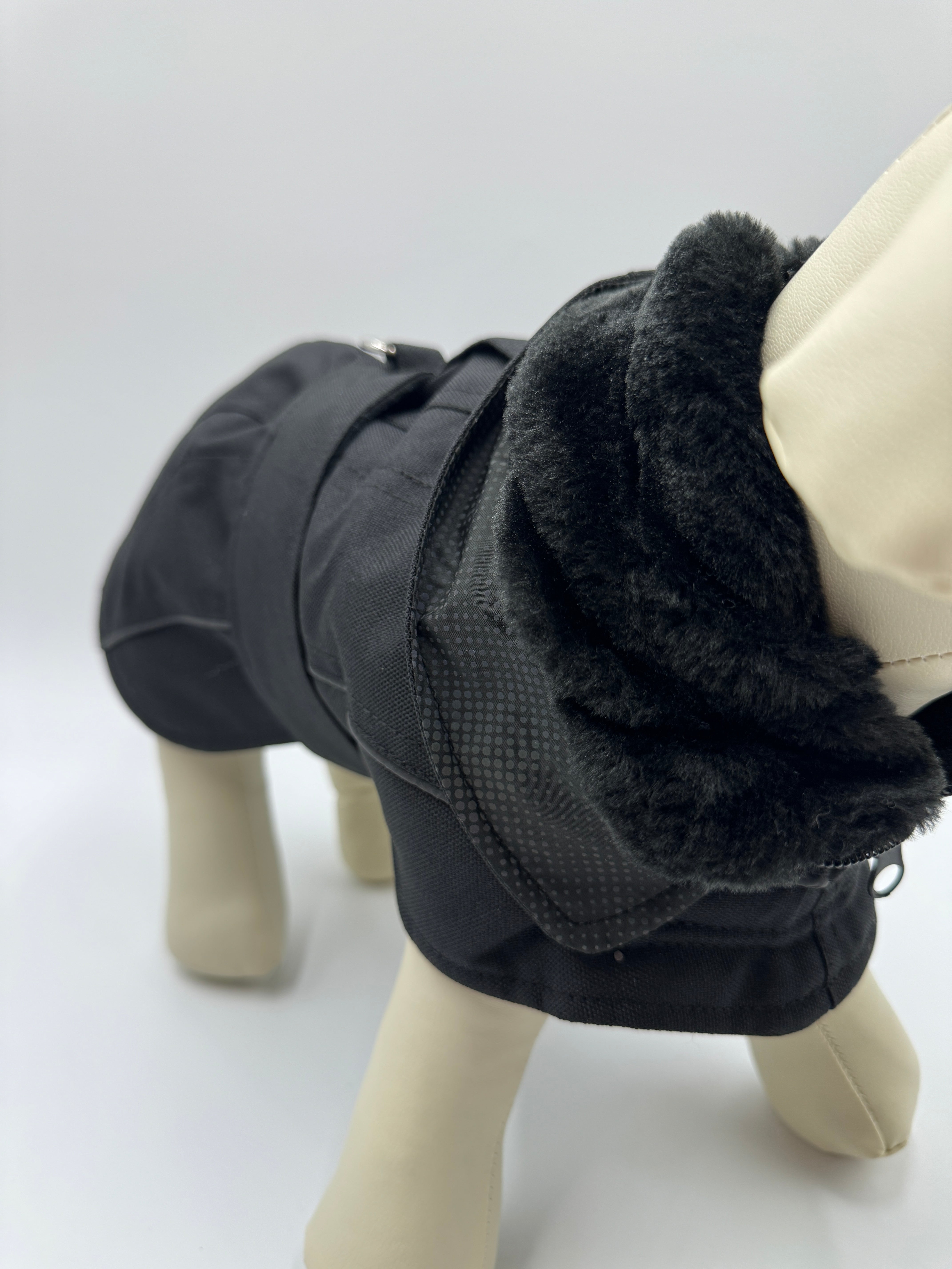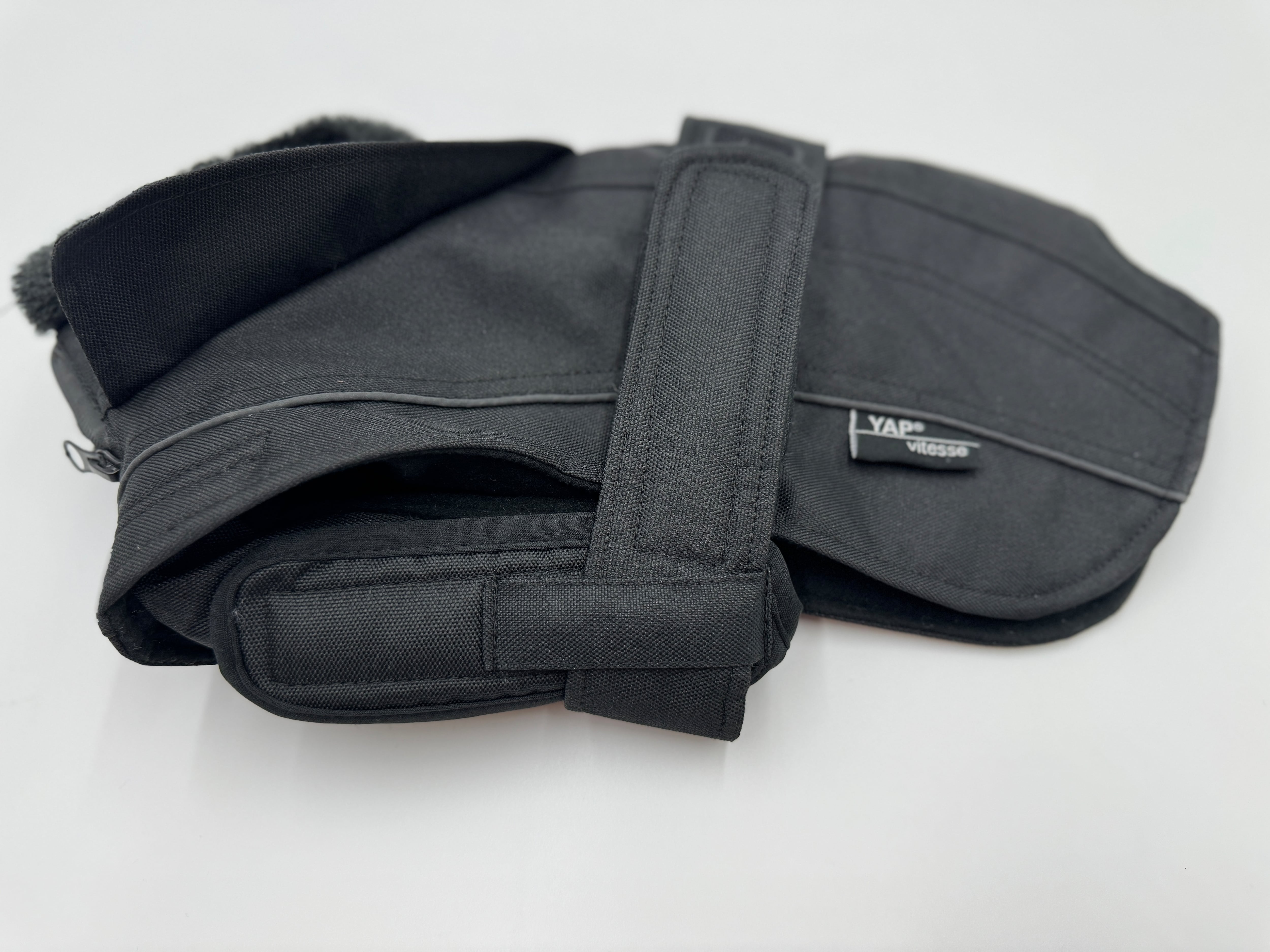 首元にはジッパーが装着されており、折り返してご使用いただくことも可能です。襟元内側はファー加工されており暖かいだけでなく愛犬の顔周りをシックでエレガントに見せてくれます。